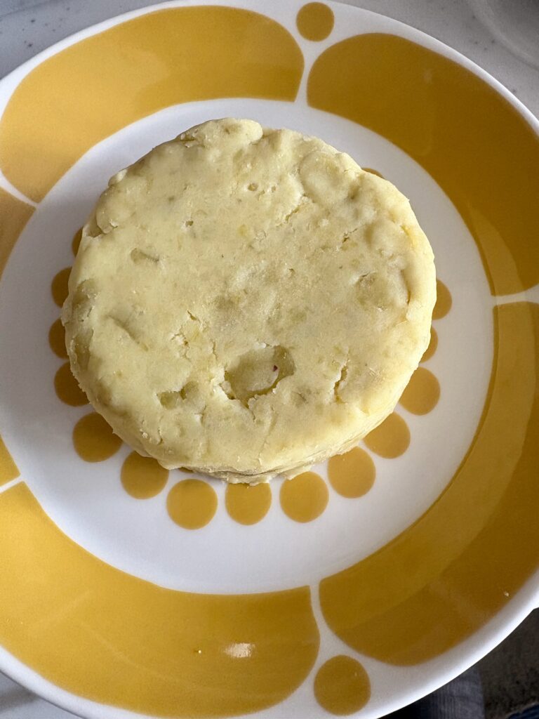 ケーキの準備、台はサツマイモのマッシュポテト。型から外して成形