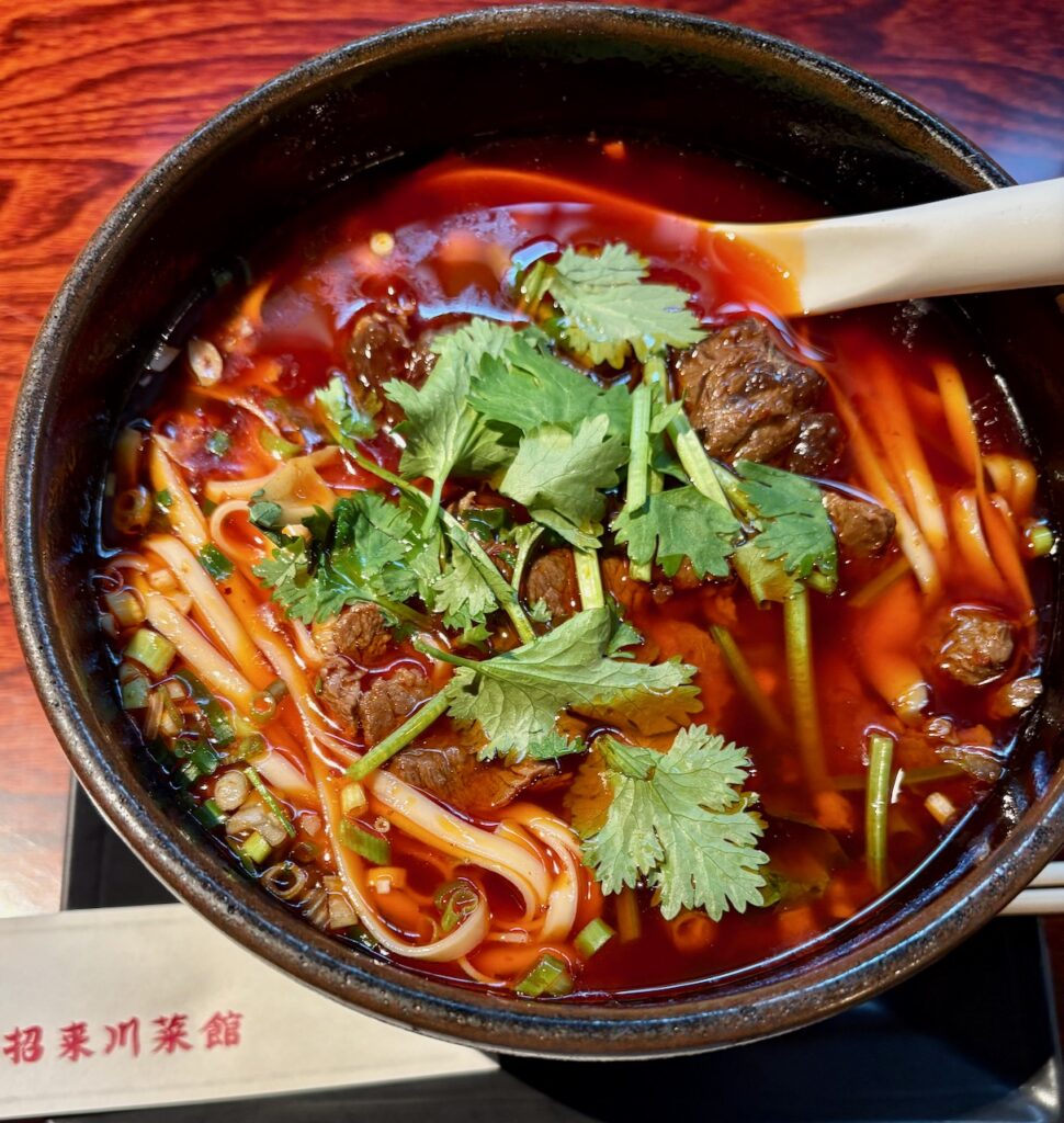 親は小平出勤、ランチは招来川菜館で四川牛肉麺。見ての通りの激辛麺ですが美味しい!牛肉もたっぷり、パクチーが良い感じ