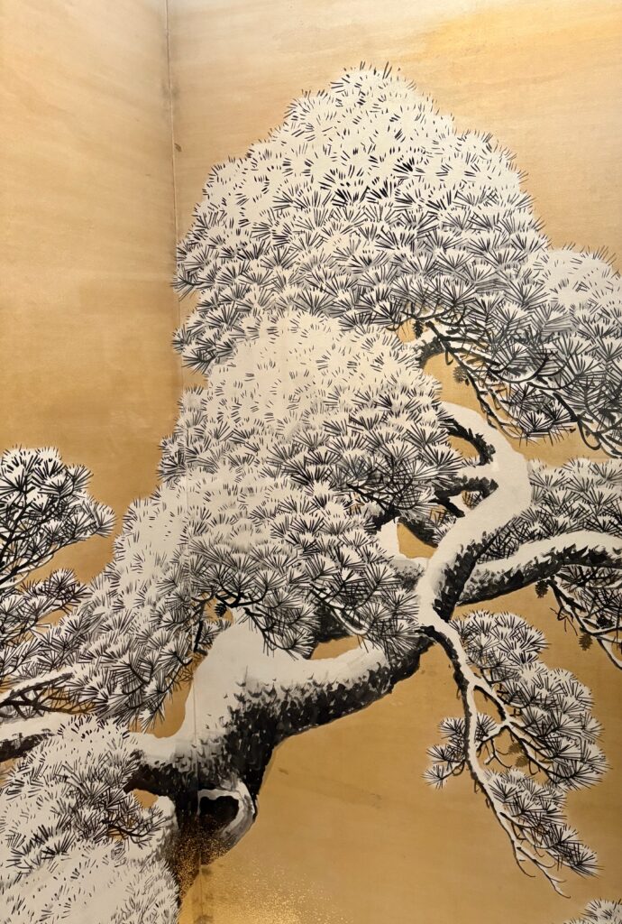 応挙唯一の国宝、雪松図屏風(三井記念美術館蔵)。ほぼ墨と金粉だけで描かれていて、雪の部分は素材の紙の白。(描かれていない)引き算の雪の質感は驚異的