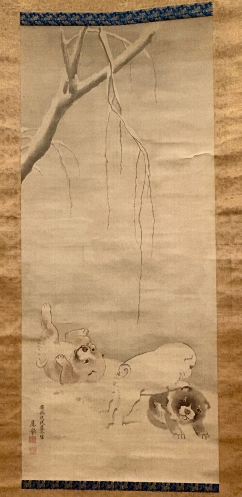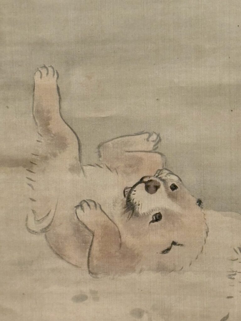 応挙の十八番、雪中狗児図の一枚。ここでも枝に積もる雪は地の紙の白